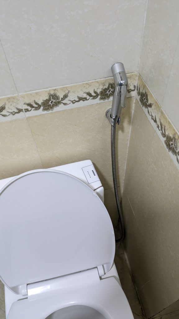 アジアのトイレによくあるハンディウォシュレット、これ、Youtubeで勉強して使いこなせるようになりました。はじめは周りをベタベタにしてママに叱られてましたが、今は完璧?です。なので、今回の食あたりではとても有効でした。