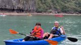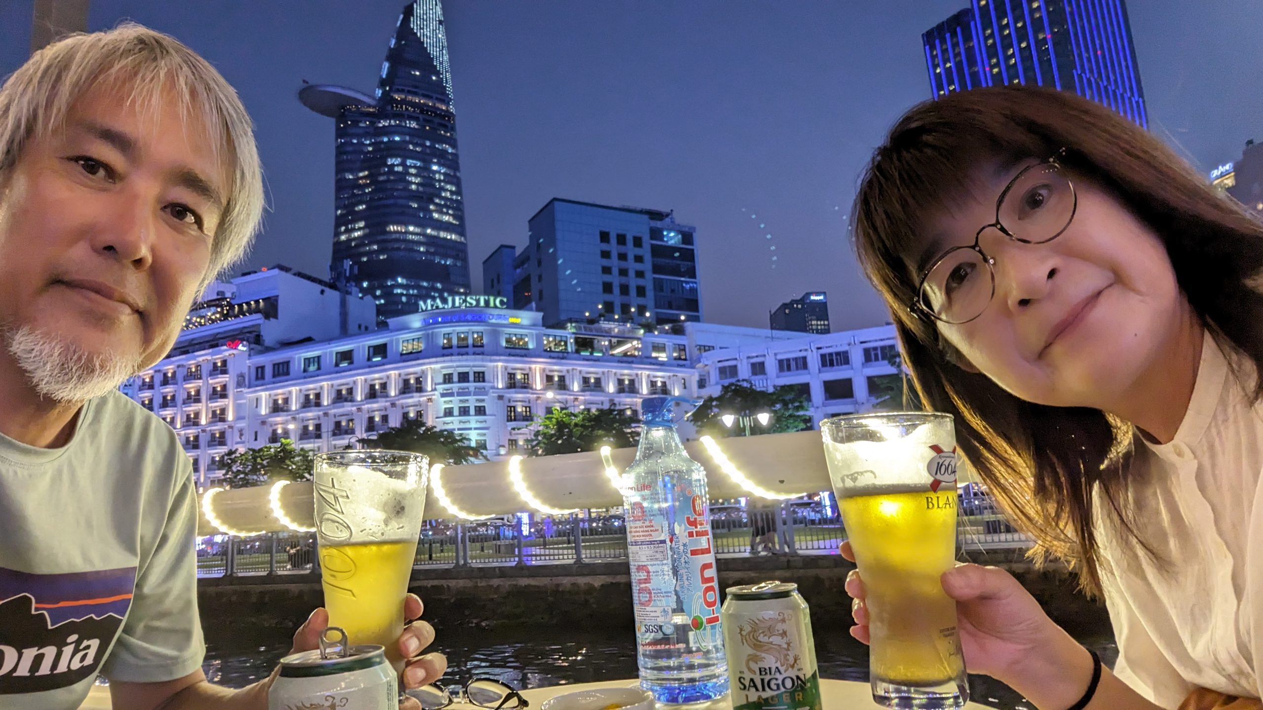 頑張って渡って川沿いカフェでビールにありつきました。バックの白い建物はHotel Majestic。ニャチャンで呼んだ本の筆者が泊まられたホテルです。★★★★★です。我々には無理。見るだけ。せめて話に出てきたカクテルを飲んでみたいのですが、Tシャツ短パンビーサンなので入れない。(笑)