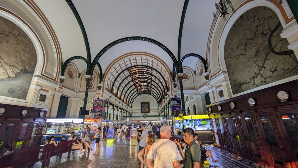 郵便局の中。なんかニューヨークセントラルの駅みたい。現在でも郵便局です。お土産屋共存ですが。ハガキ用の切手を買いたくて窓口で注文するのですが、どうしても買えない。30,000VND(180JPY)のスタンプくださいといったらどこに送る?と聞かれるのでPOSTCARDを日本へと答えるとそれは840,000VND(5,040JPY)ですと。なんでハガキ一枚でそんなにするねん!て言うと先方も怒り出してガチャガチャ不明なことを言ってきます。よっぽど私の英語が通じないんですね。ショックです。今日は諦めました。観光地でない郵便局で買います。