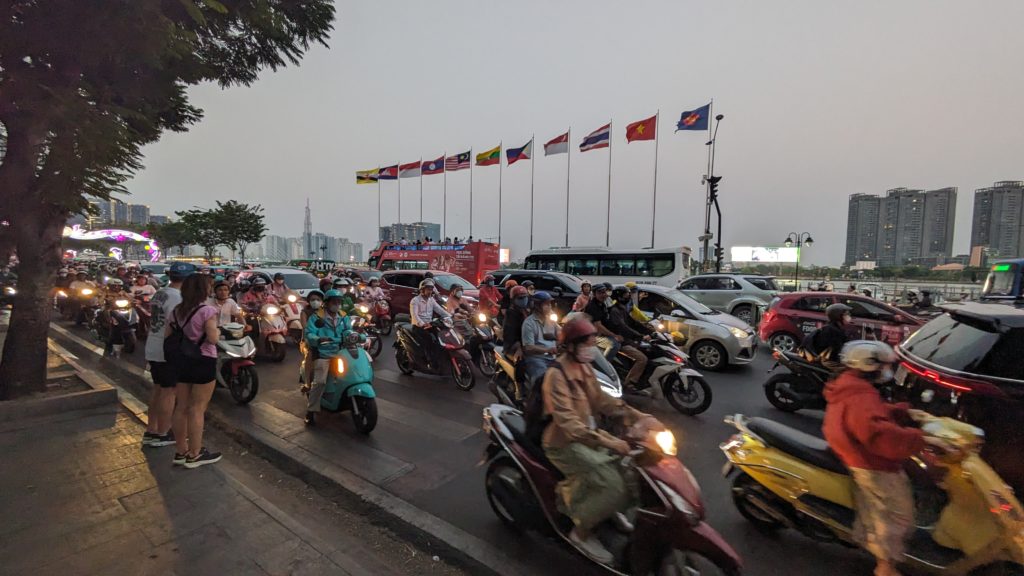 そしてサイゴン川沿いまで散歩で来ました。旗がたっているところまで行きたいのですが、帰宅ラッシュアワーでこの道路の混みよう。これを渡るんですよ。勇気いるわー。