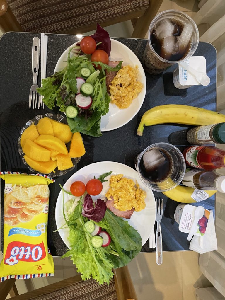 2024/3/26(火)。キッチン付きのアパートメントタイプの部屋を借りたので朝ごはんぐらいは意地で作っています。といってもタマゴとベーコン焼くぐらいですけどね。マンゴーは安くて超美味しいので外せません。