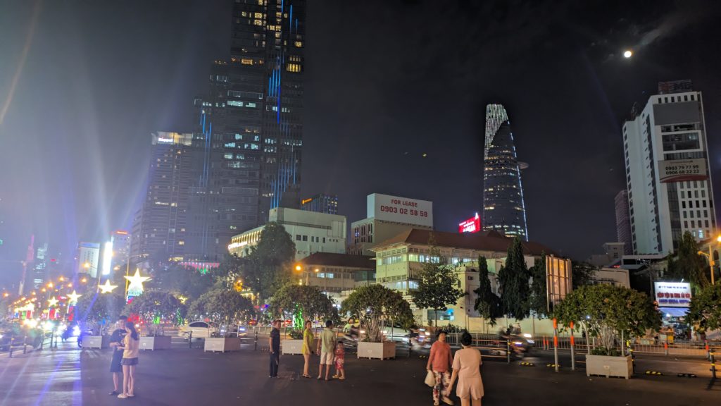 ベンタイン市場からの夜景。右上は月。たぶん満月ですね。