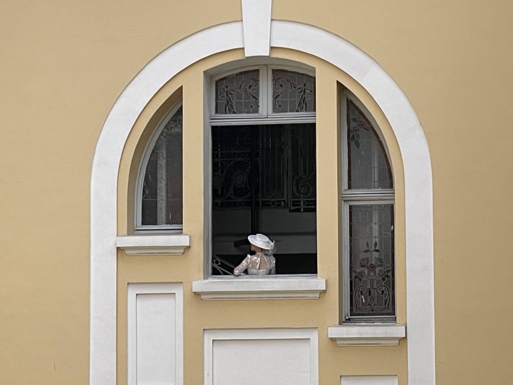 建物の窓をみるとこんなお人形さんのような人が。人形ではありません。