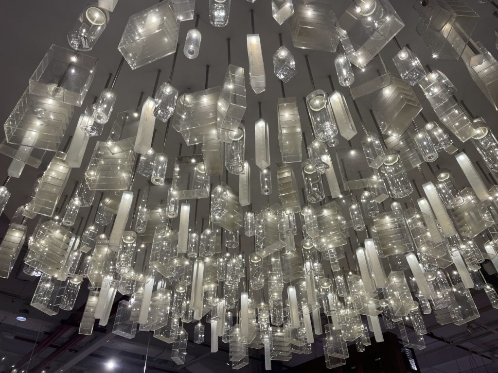 天井には無印で売っているものがシャンデリアになっていました。