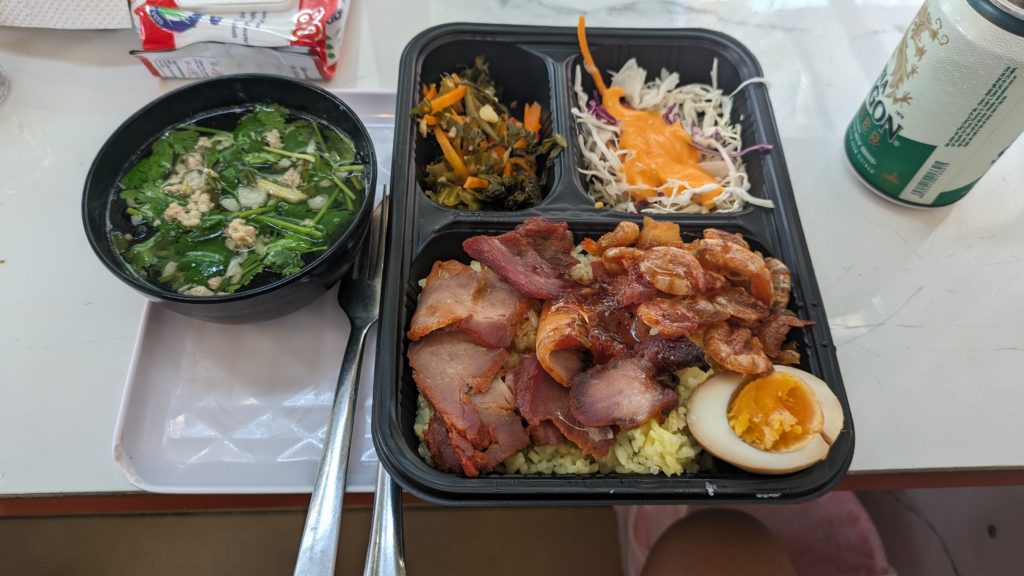 会社の弁当みたいな容器ですね。屋台ですから。ビールは隣のお店から調達してきてくれました。これはポーク。