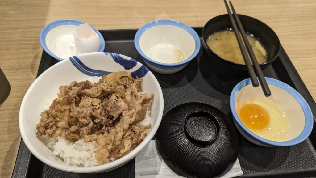 2024/5/1。メーデー? 今朝はホテル近所の松屋朝食から。これ290円。日本安すぎ。