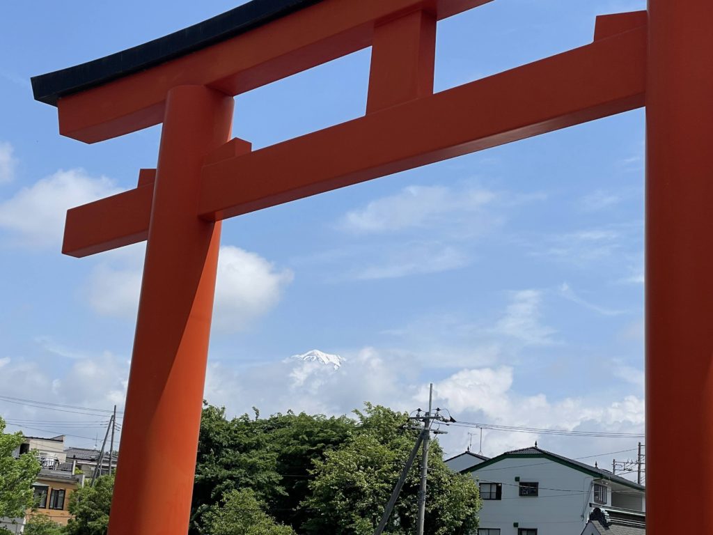 鳥居越しにも富士山です。雲があるのでちょっとわかりづらい。