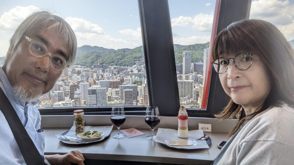 まずは回転レストランから。ワインやビールで2周しました。3周もできたけど飽きた。ポテサラ美味しい。イカリ形の蒲鉾が乗っています。おつまみの瓶やいちごパフェの瓶もポートタワー形。お持ち帰りしました。