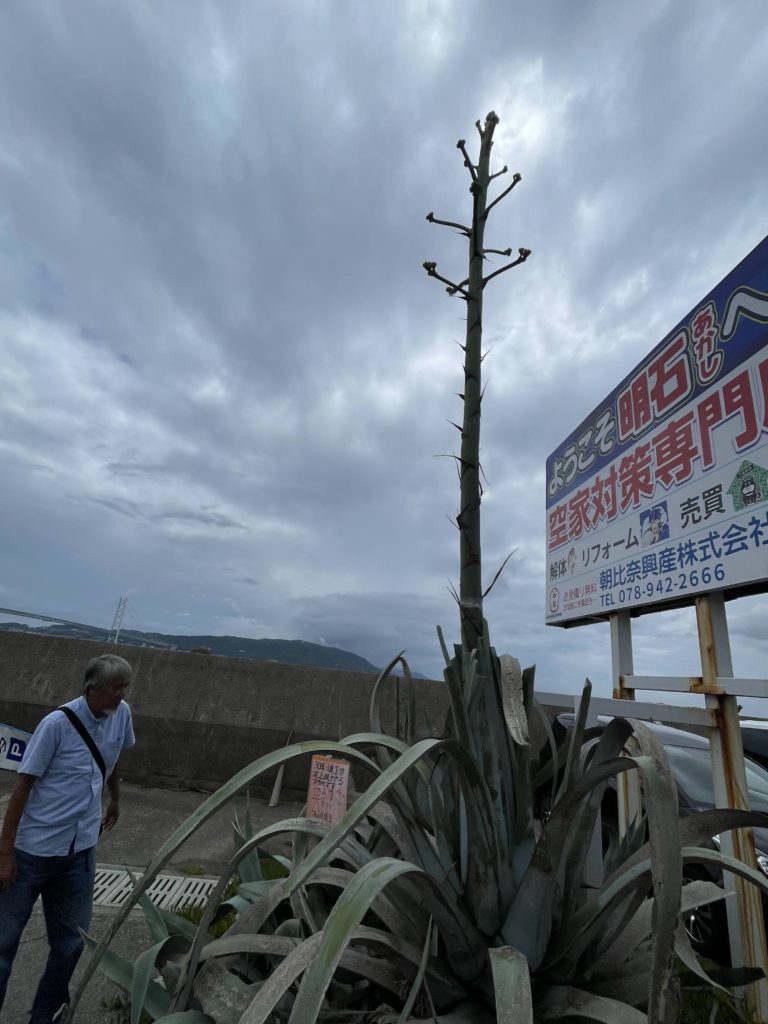 近所のフィエスタ(レストラン)の駐車場にある木。30年に一度しか咲かない花がぐんぐん伸びてきました。リュウゼツラン。このあと花開いてそして...(;_;)
