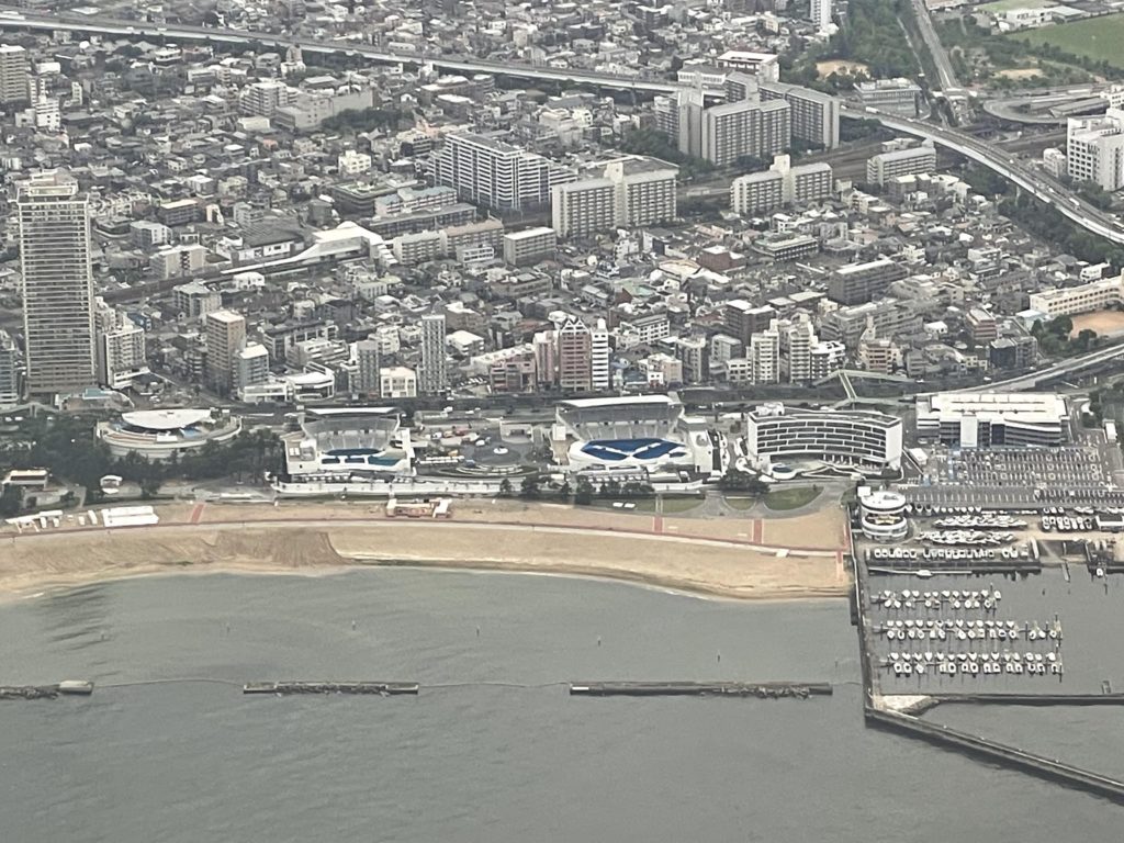 離陸しました。すぐに須磨のマリーナと須磨海岸が見えます。すでに海水浴の海の家が出てきています。