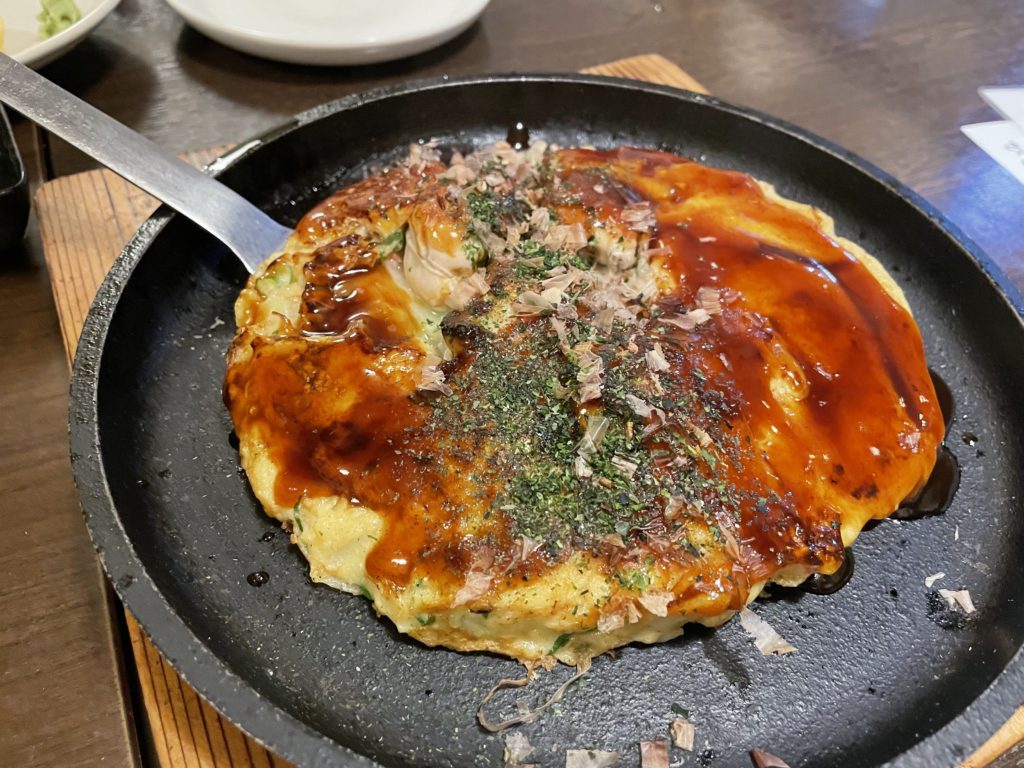 大きな牡蠣が4匹も入ったお好み焼き。生地は山芋ホイップな感じでこれも美味しかったー。ソースは広島のカープでした。すでに広島入ってきてる。
