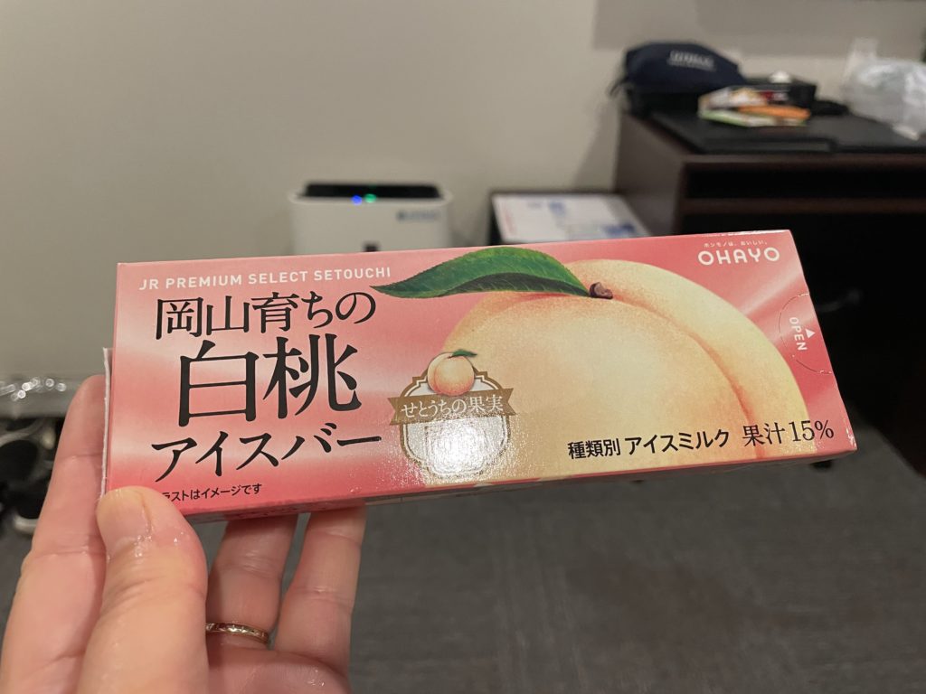 デザートはコンビニで買った岡山育ちの白桃アイスでしたー。お疲れ様ですー。明日はどこまで行けるかなー。