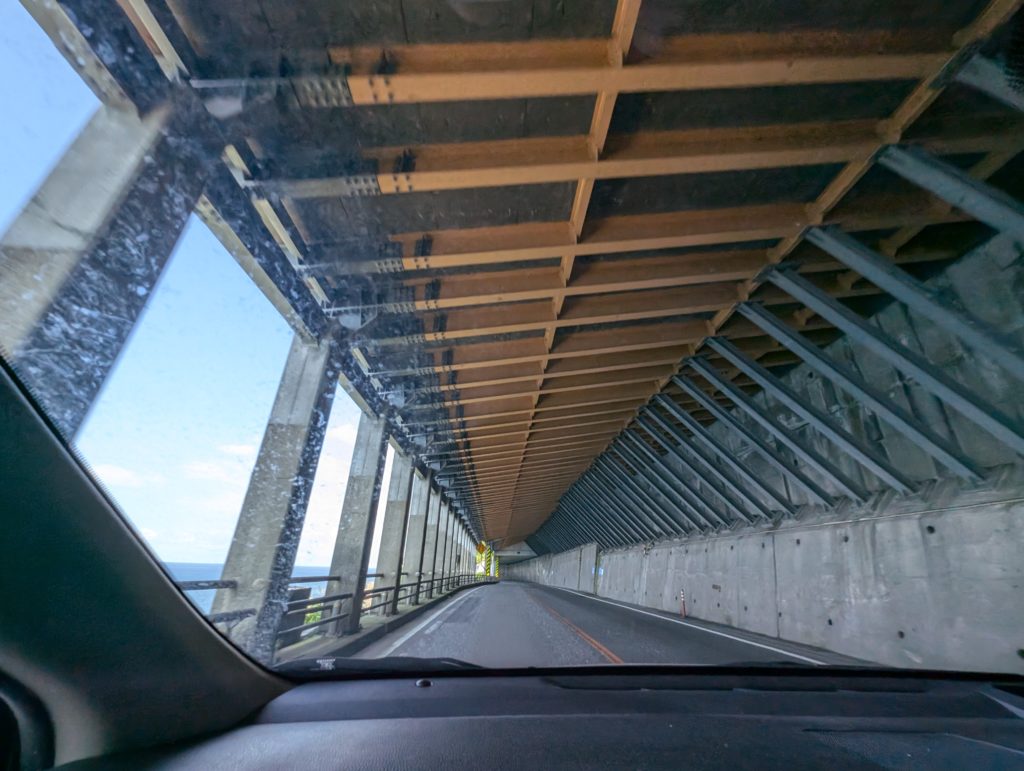 親不知にさしかかりました。海岸線の屋根のある道路。