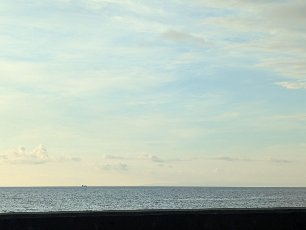 拡大してよーく見ると佐渡ヶ島が見えています。佐渡ヶ島って本州からはうっすらとしか見えないってことを学びました。