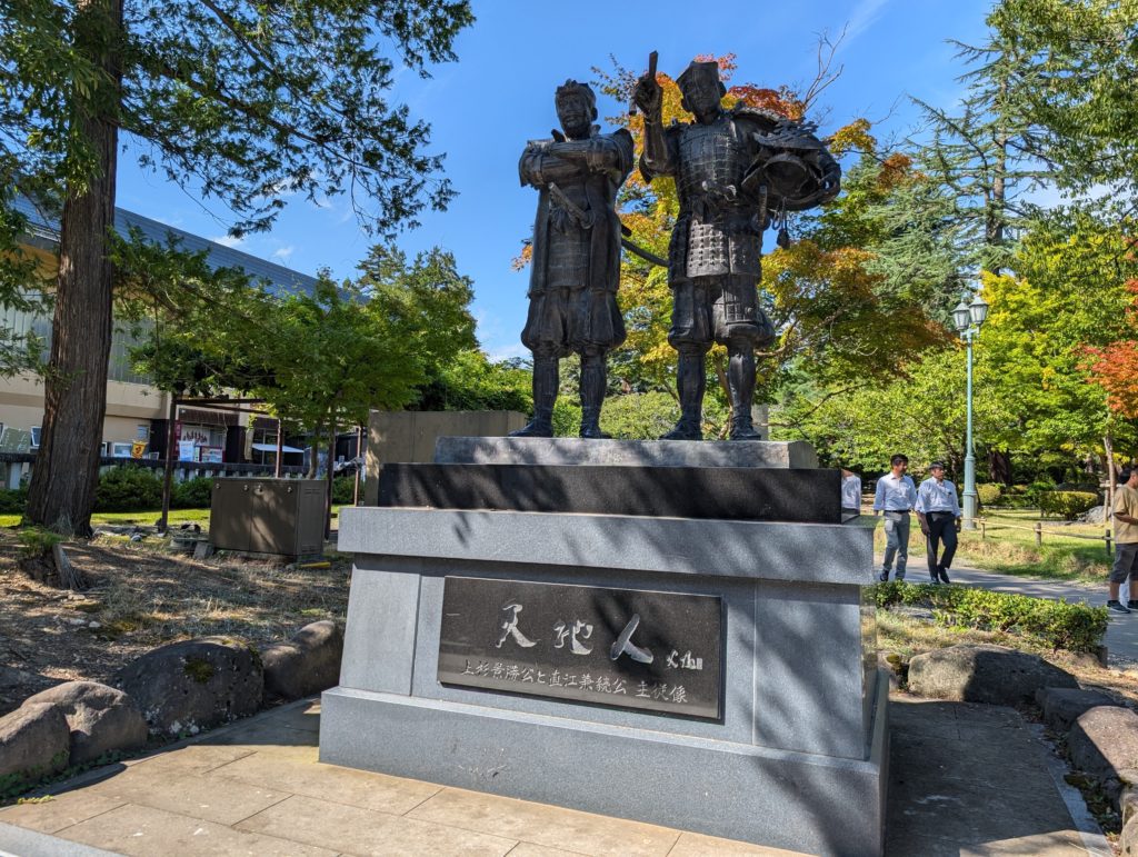 上杉景勝と直江兼続主従の像。上杉ファンの聖地ですね。