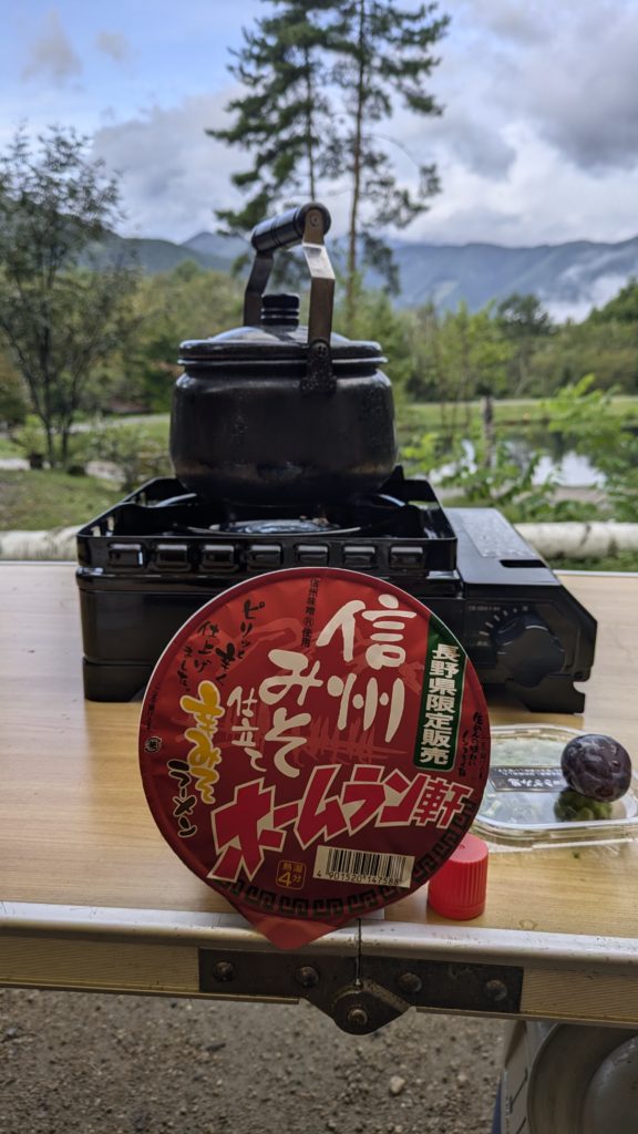 2024.9.19(木)。高ソメキャンプ場三日目の朝です。ちょっと雨。朝ごはんは昨日に続きホームラン軒の信州味噌ラーメンです。今朝は辛口。