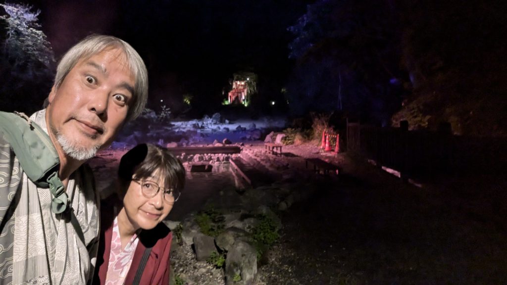 24時までライトアップ、お店も開いてます。いゃあ草津温泉は頑張ってるなあ。我らの有馬温泉なんてすぐお店閉まるし。