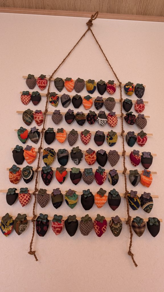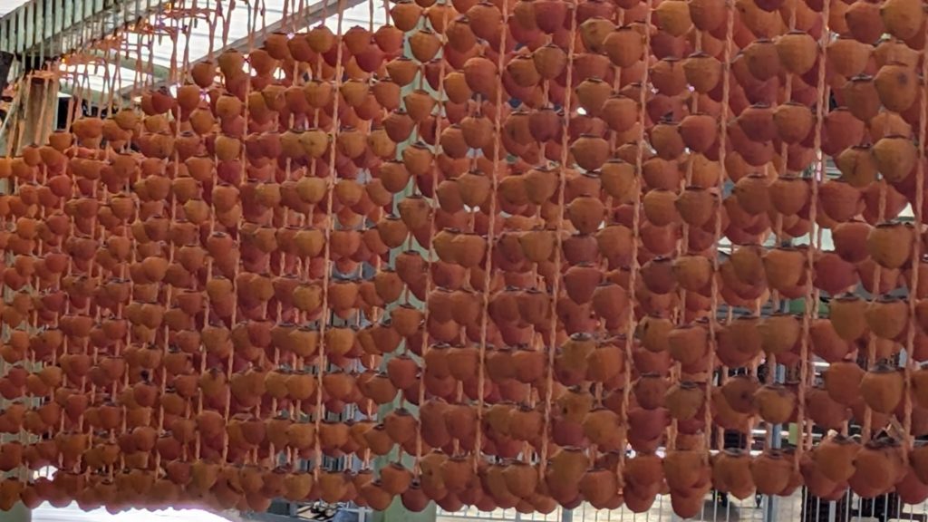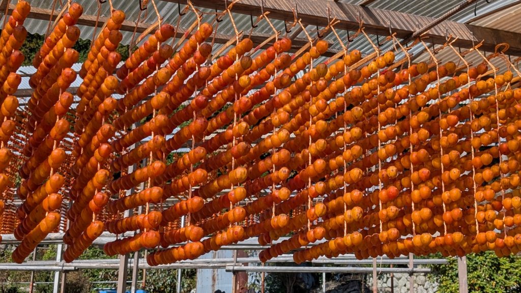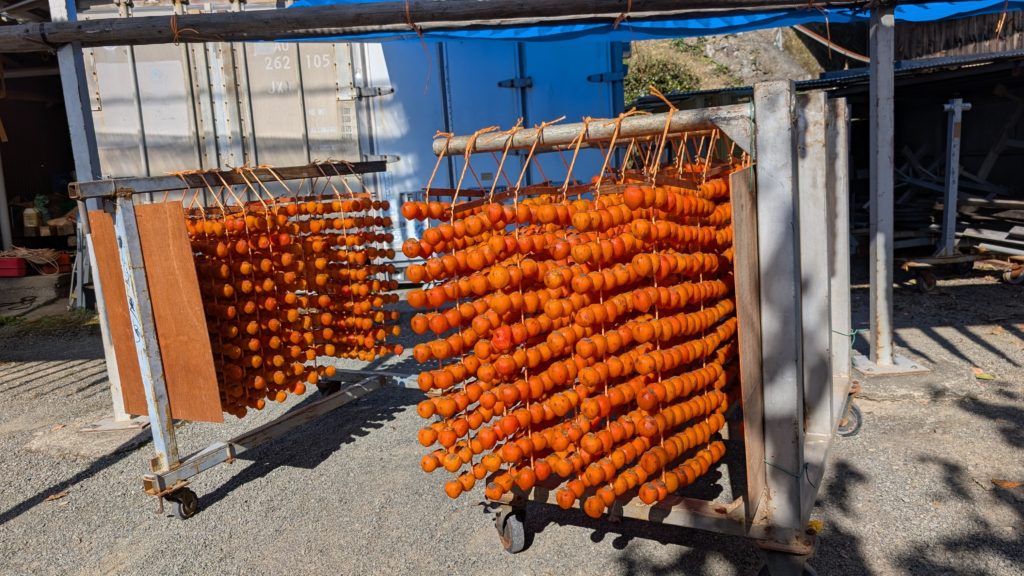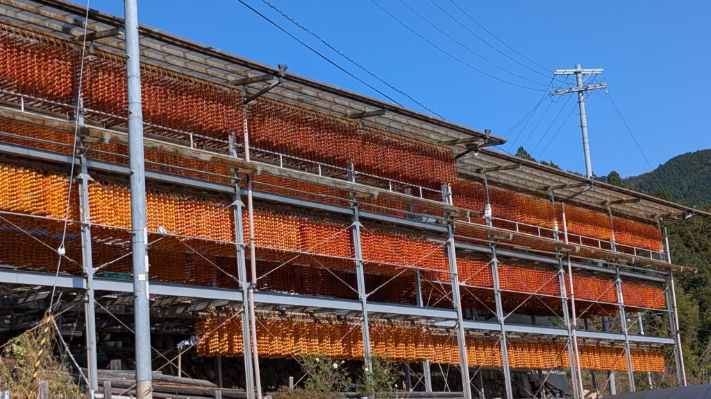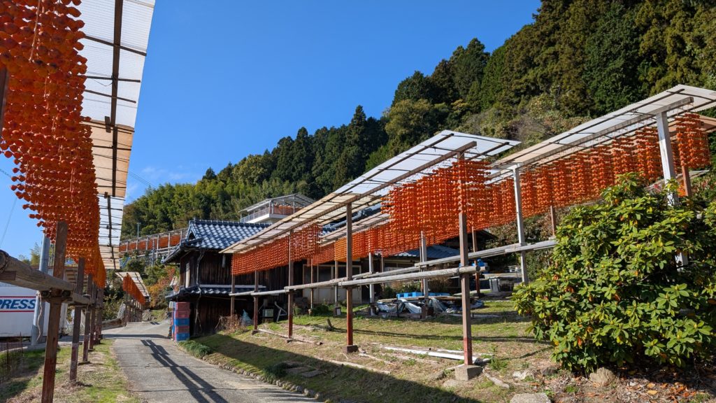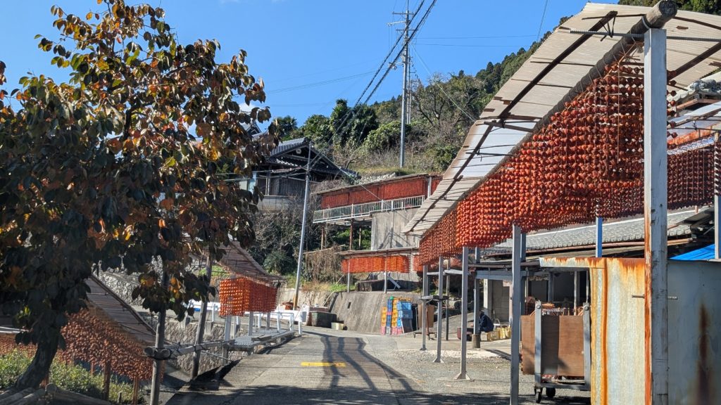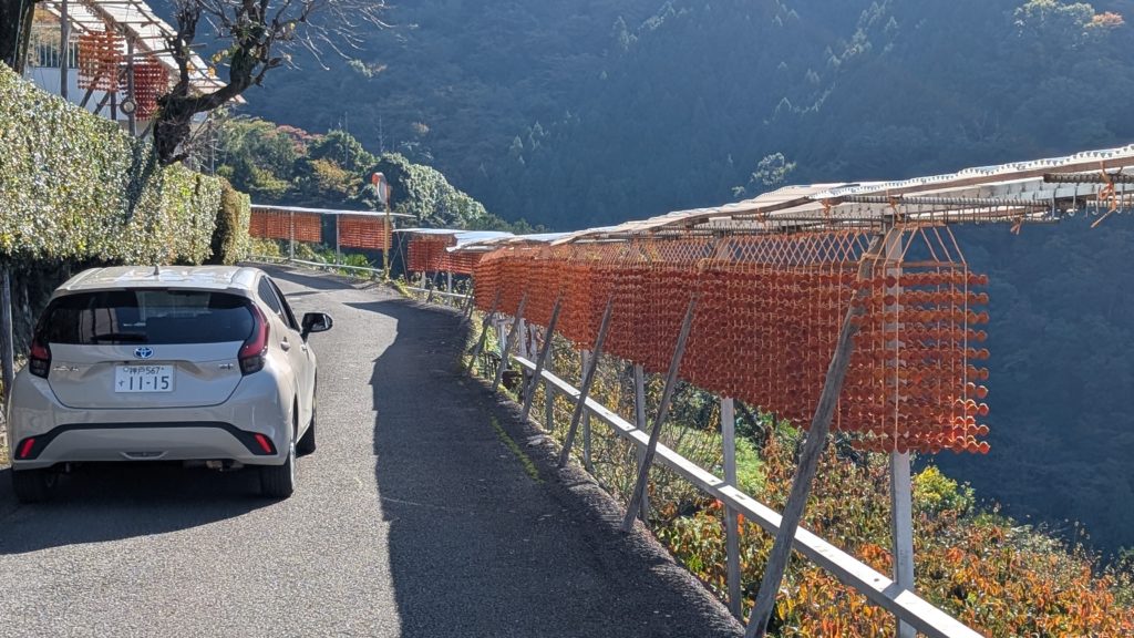 和歌山あるあるのめっちゃ細い道を登った先の小さな集落。その道沿いに串柿を干している棚がたくさんありました。