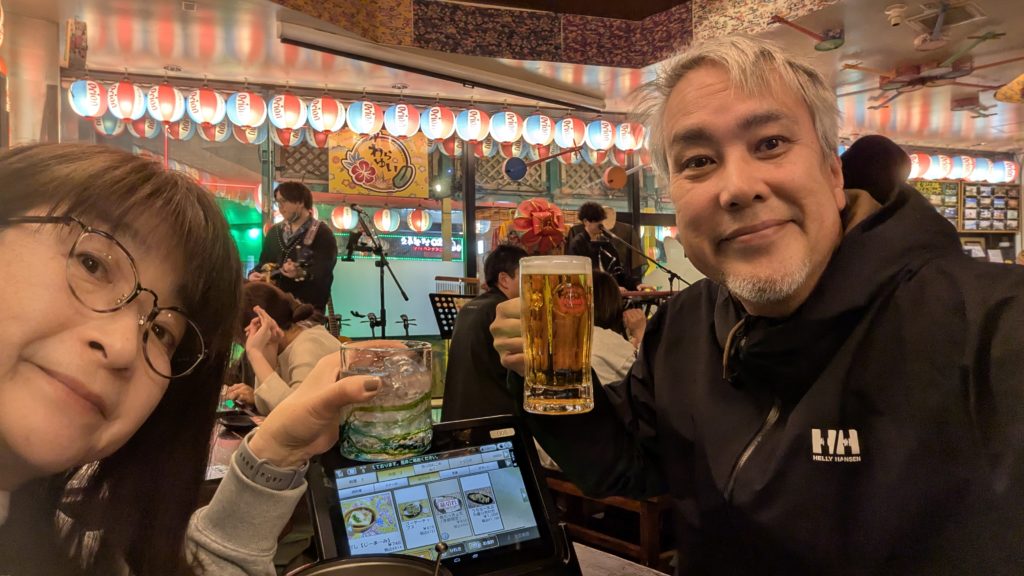 そして夜はまたライブ居酒屋。若い男性二人のバンドでした。もちろん沖縄民謡やるんですが、間にオリジナルなバラード系のフォークソングなんかを挟んできます。なかなか斬新で楽しかった。沖縄民謡居酒屋とは一味違うライブでした。