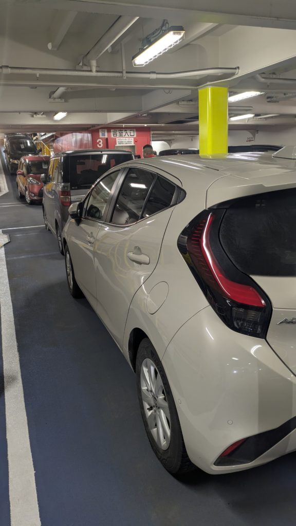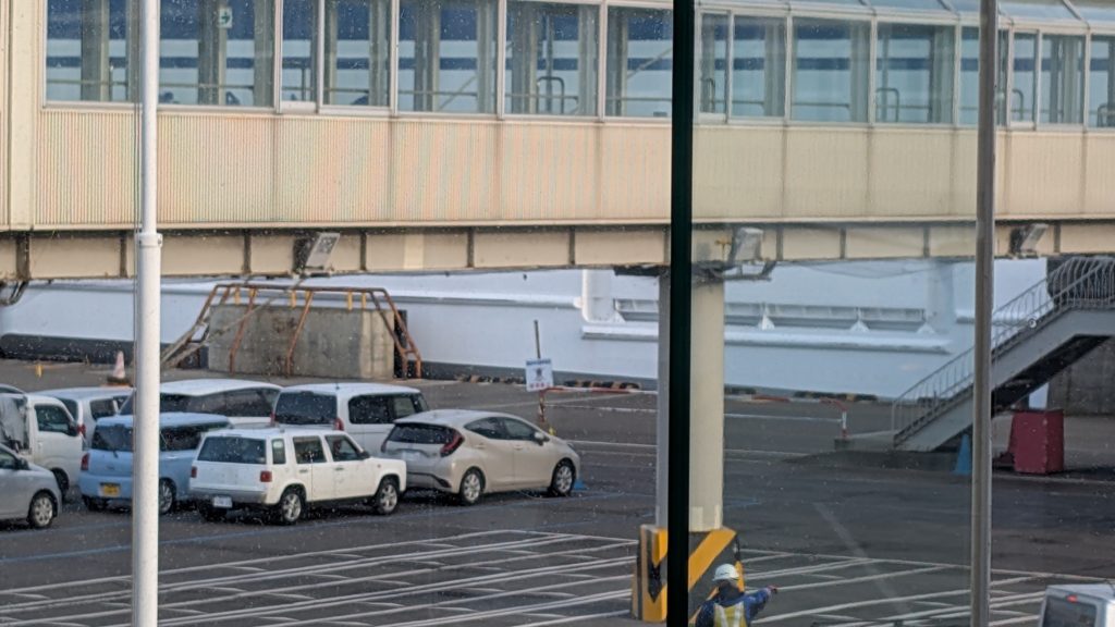 車両甲板に取り残されるアクア号。ま、40時間ゆっくり休んでくれ。今朝シャワーも浴びたしな。おつかれ。名古屋ついたら神戸まで陸送やからなー。
