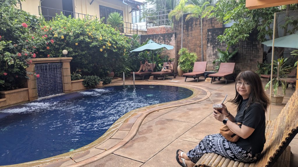 2025/5/19(月)。シュムリアップのデンホテルです。4泊目の朝。おはようございます。このホテルええわ。クイーンサイズベッド☓2。プールもあるしバーもあり。ノンストレスです。シーツも袋タイプでしあわせ。