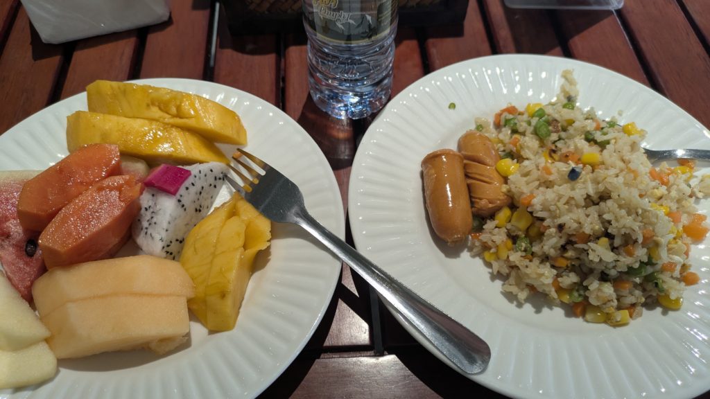 ホテルの朝ご飯。パンとか麺が食えないので焼き飯。あとこれにでっかいオムレツも来ます。めちゃいっぱい食べている。