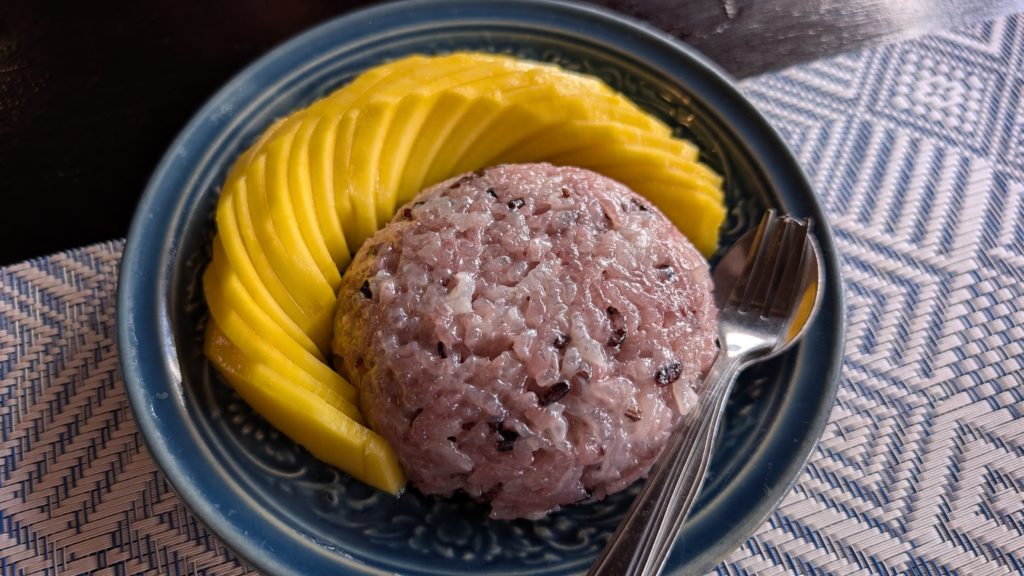 ママは大好きなマンゴースティッキーライス。ココナッツミルクで炊いたもち米(おこわ)とマンゴーのセットです。マンゴー好きにはたまらないらしい。