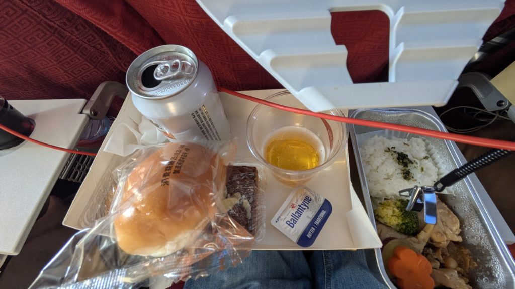 機内食。チキンライスとパンの下に隠れているオカズとケーキでしたー。普通においしかったよー。
