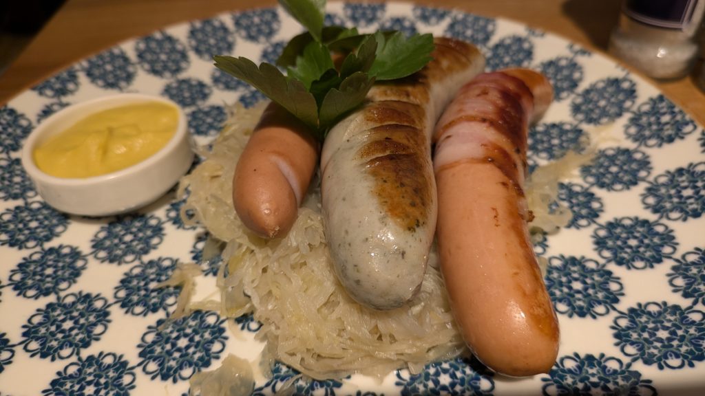 ソーセージセット。あと、下に敷いてある酸っぱいキャベツの漬物「ザワークラウト」。キャベツを乳酸発酵させたヨーロッパで広く親しまれている発酵食品らしい。思ったほど酸っぱくなくて残念。残した。