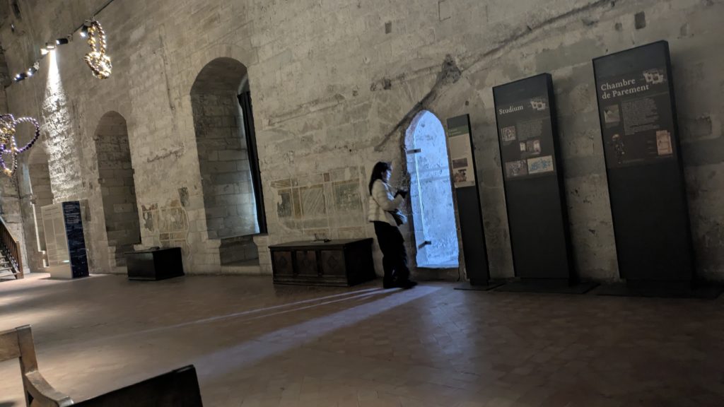 だだっ広いのでこんな飾りあるし。ところでアヴィニョン教皇庁てなんやねん?て話ですが、Wikipediaで読んでちょ。難し過ぎて無理やな。ま、一言でゆうと今はバチカンにあるキリスト教の本部的なやつの1300年代もの。タブレットではこないだあったコンクラーベ(教皇選挙)をここでやってた様子がタブレットで見れたりする感じ。