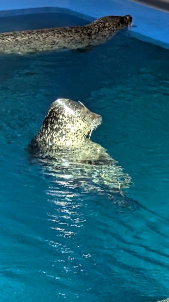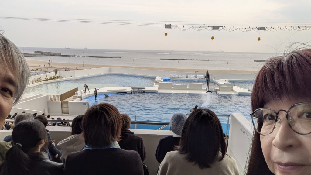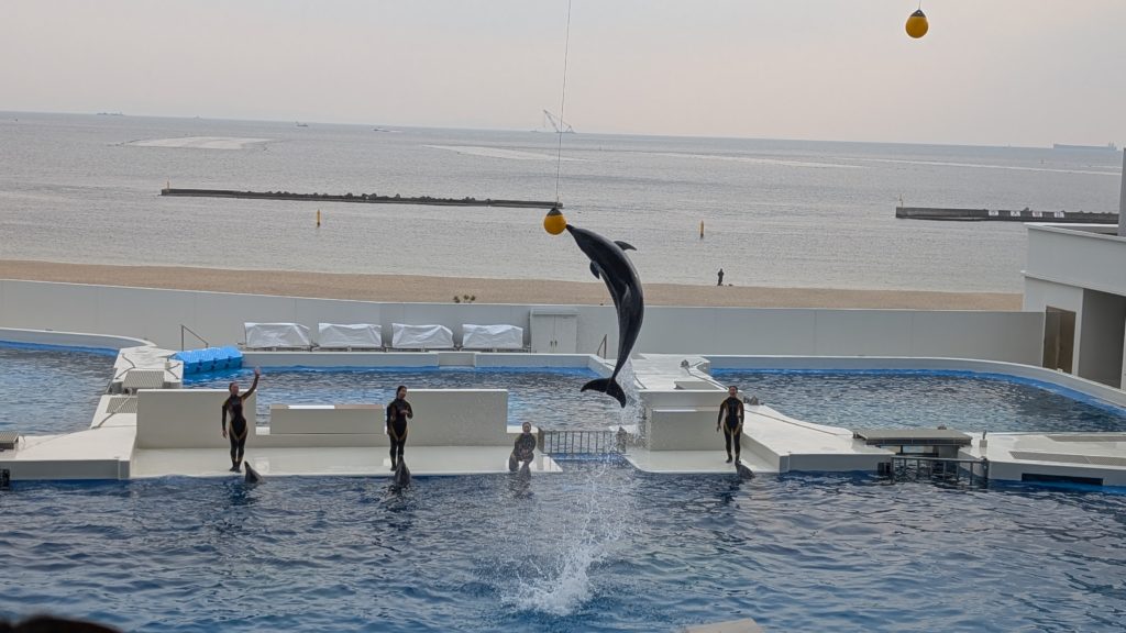 はい入場。まずはドルフィンショーから。実は今日は神戸市民デーで神戸市民は1000円なのです。というわけで混雑していてドルフィンショーに並んで入って始まりまってとなり1時間ロス。