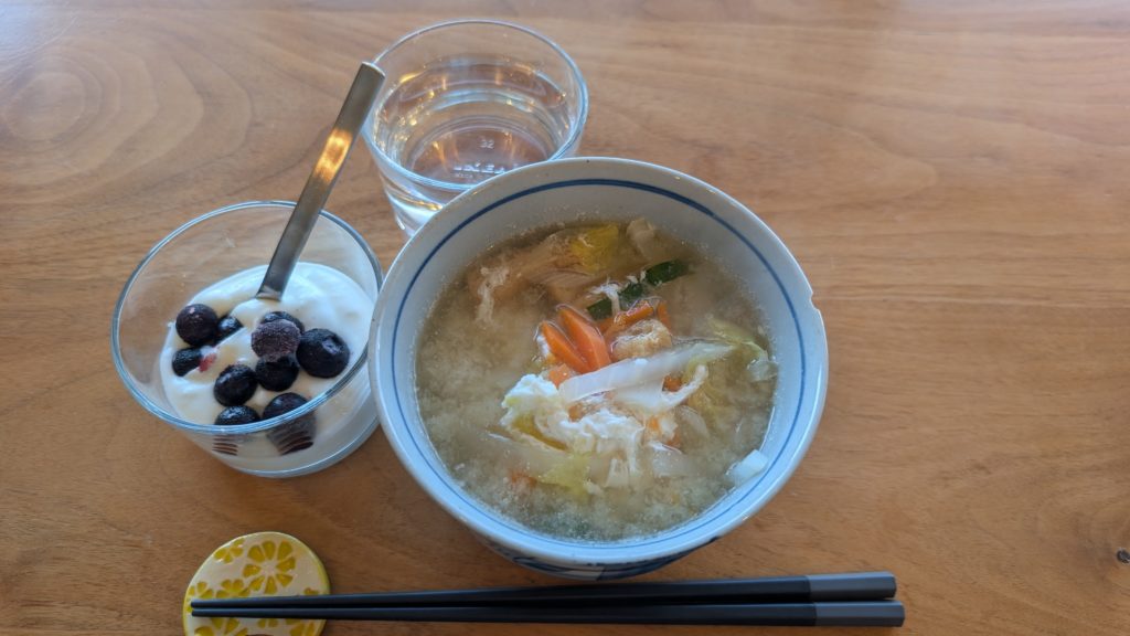 2025/12/19(金)。朝食はお雑煮から。白菜の味噌汁に玉子とお餅をぶっこんだオールインクルーシブ朝食。さすがにヨーグルトはぶっこむのやめた。