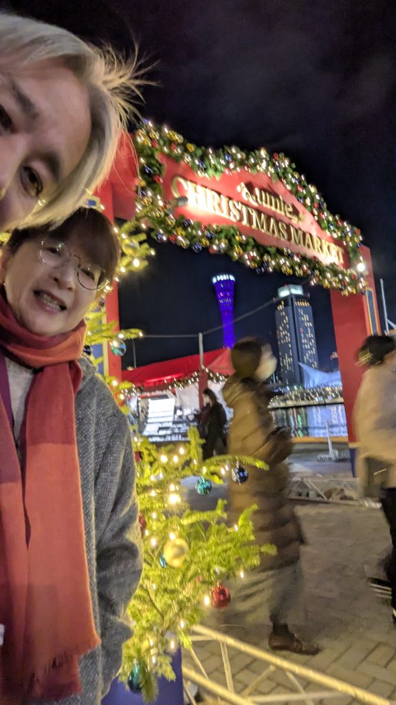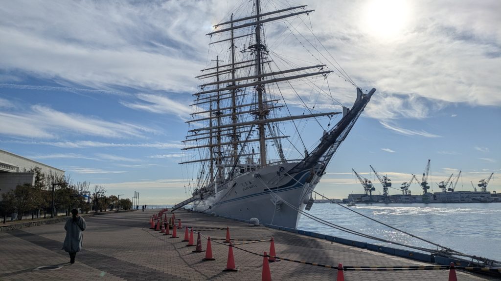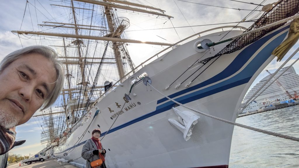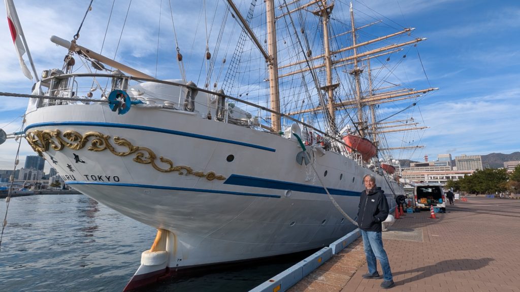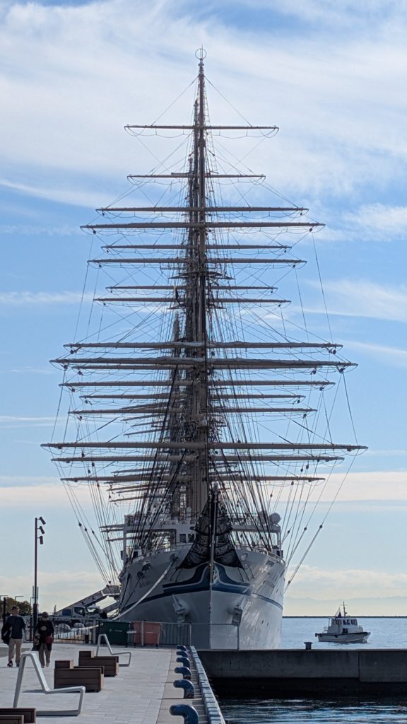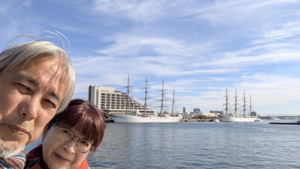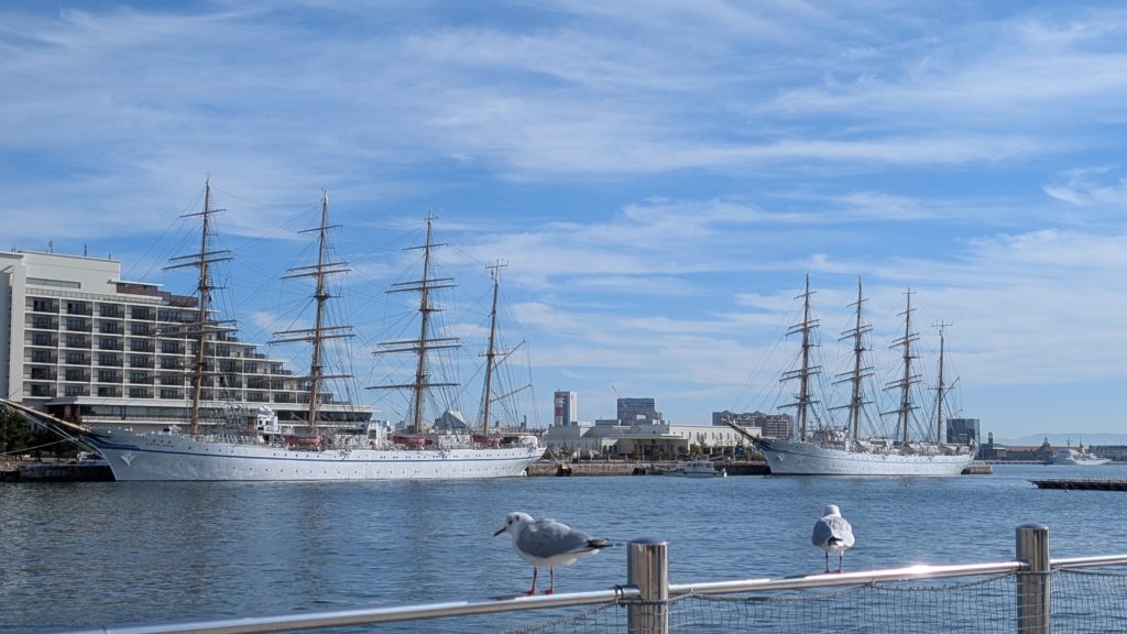 今日のお目当てはこちら。日本丸と海王丸がならんで入港されています。今年の年越しは神戸らしい。