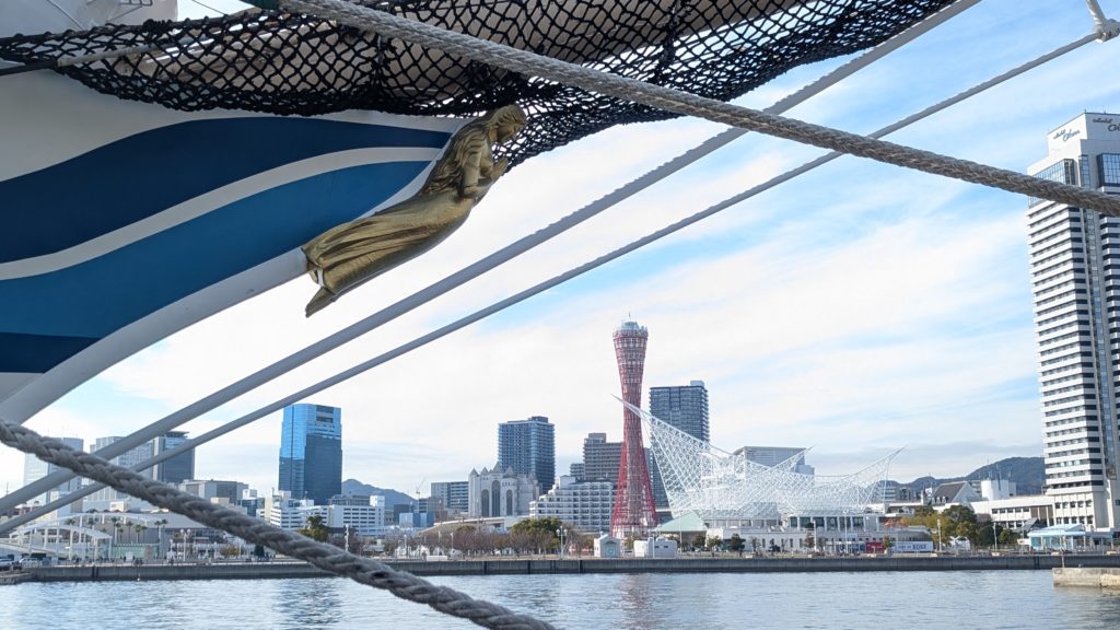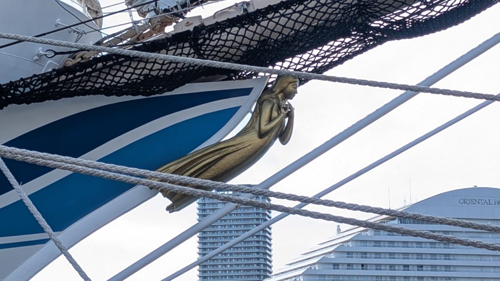 日本丸の船首像(フィギュアヘッド)は「藍青(らんじょう)」という名前の女神像で、合掌した優美な姿が特徴です。