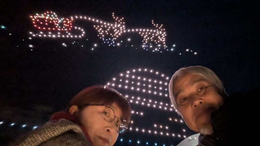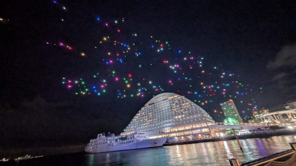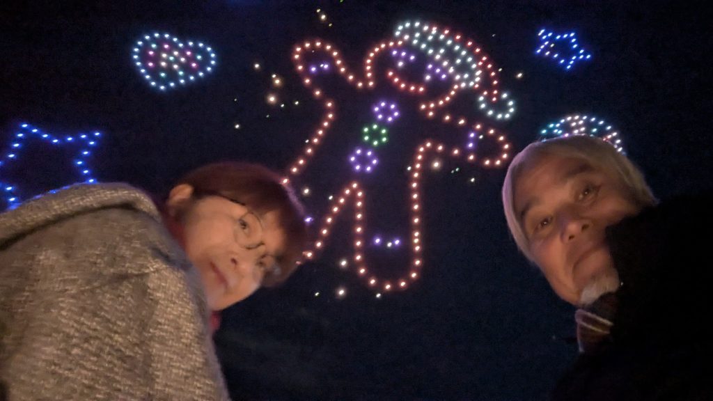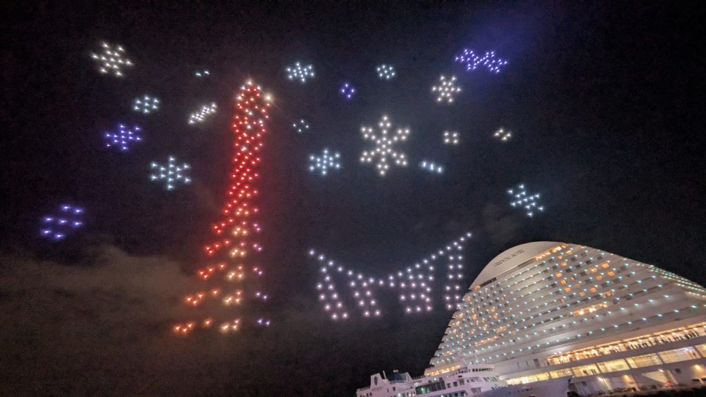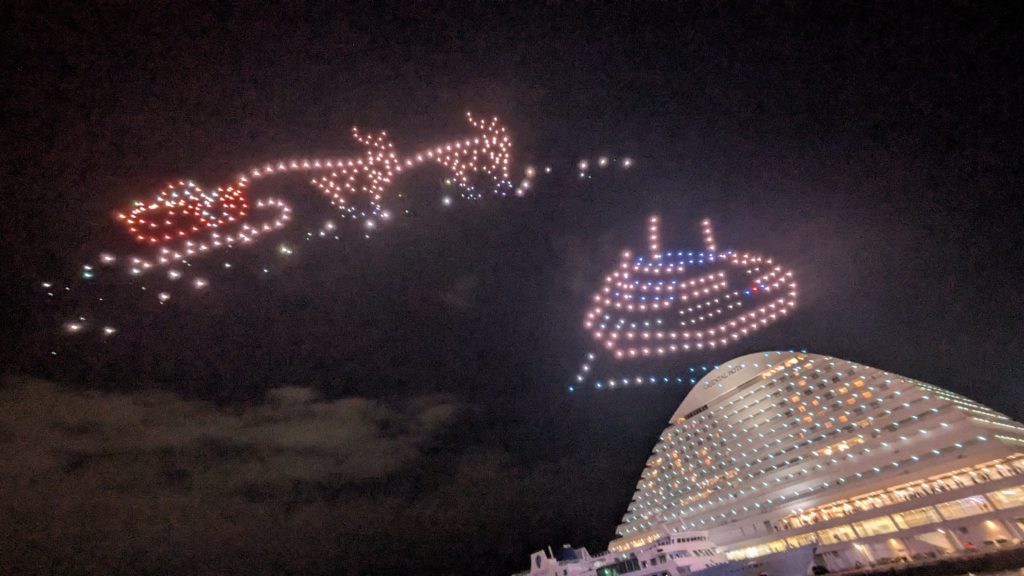 最後はいろんな色に発光した500匹のドローンたちが帰っていきます。なかなかかわいい。