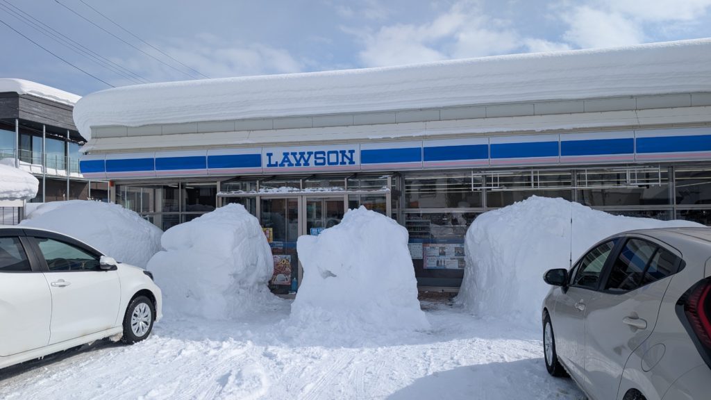 酸ヶ湯温泉旅館はきっと現金社会やでー、ということで現金を用意しにコンビニへ。入口はこんな感じですわ。LAWSON(笑)。
