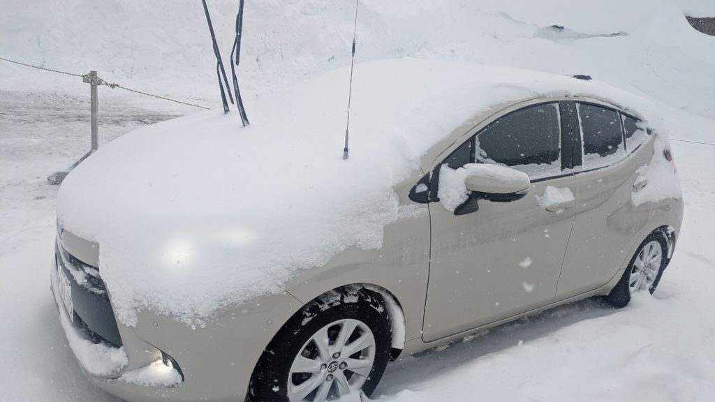 我らのアクア号は?? あらこの程度でした。よかった。これなら雪かきは楽勝ですね。FFと4WDの違いはここから出られるかどうかです。あとはもう除雪道路なのでFFでもいっしょです。むしろ車重が軽いアクアはSUVより有利です。