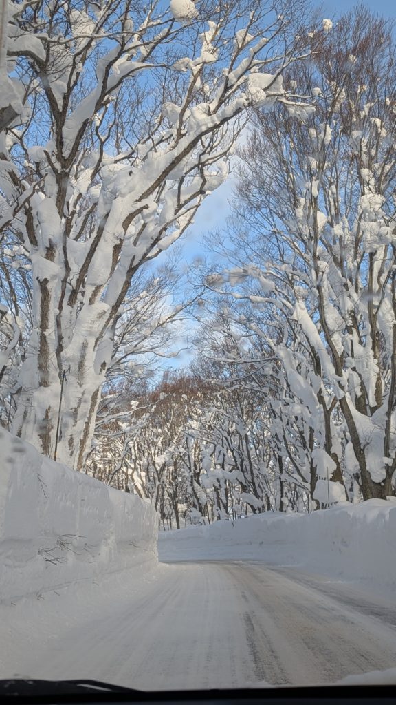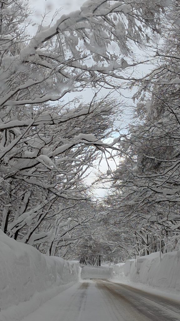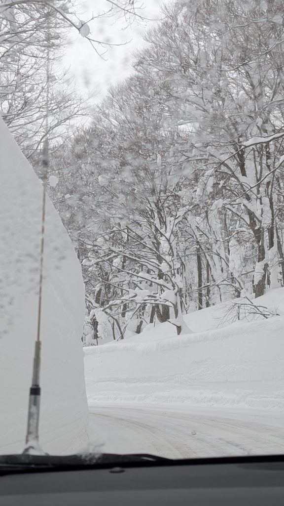 無事出られました。やったね。さ、下山です。道路はこんな雪の谷間です。なんかもう美しい。