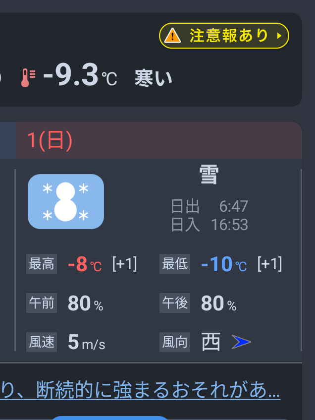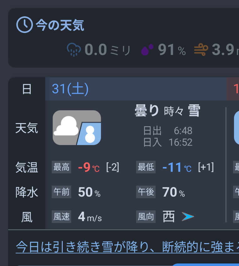これは昨日の天気。後半が雪なんです。しかも今夜はマイナス11℃。やっぱー。