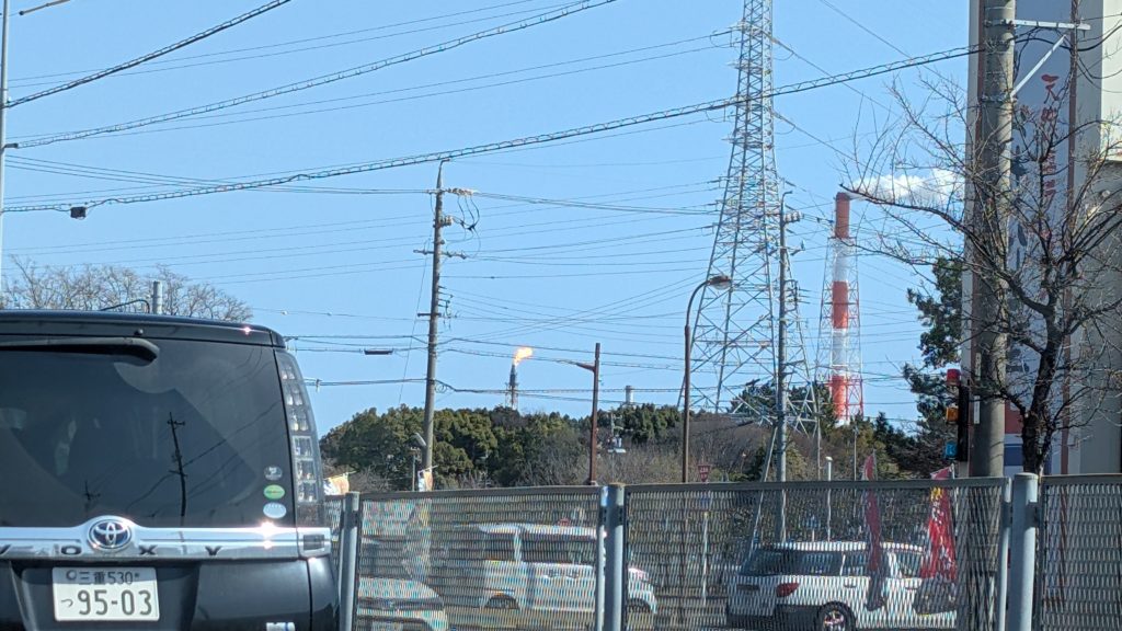 四日市の工業地帯を通過中です。火が燃えてるわー。