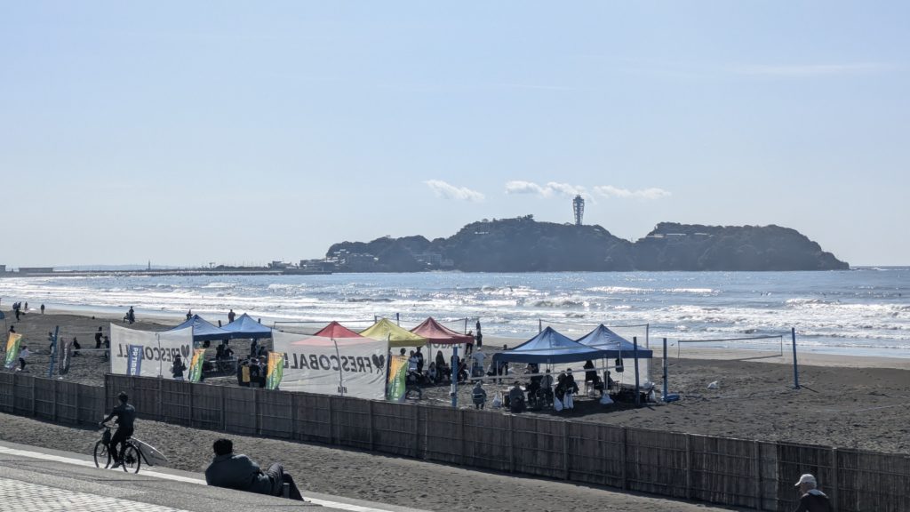 2026/3/7(土)。フレスコボール湘南カップが始まりました。会場です。後ろは江の島。