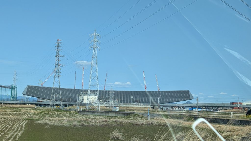 安八スマートICを出ました。ここ、なんと!現役時代に新幹線からよく見たサンヨーのソーラパネル!負の遺産!わー、ここにあったんかー。