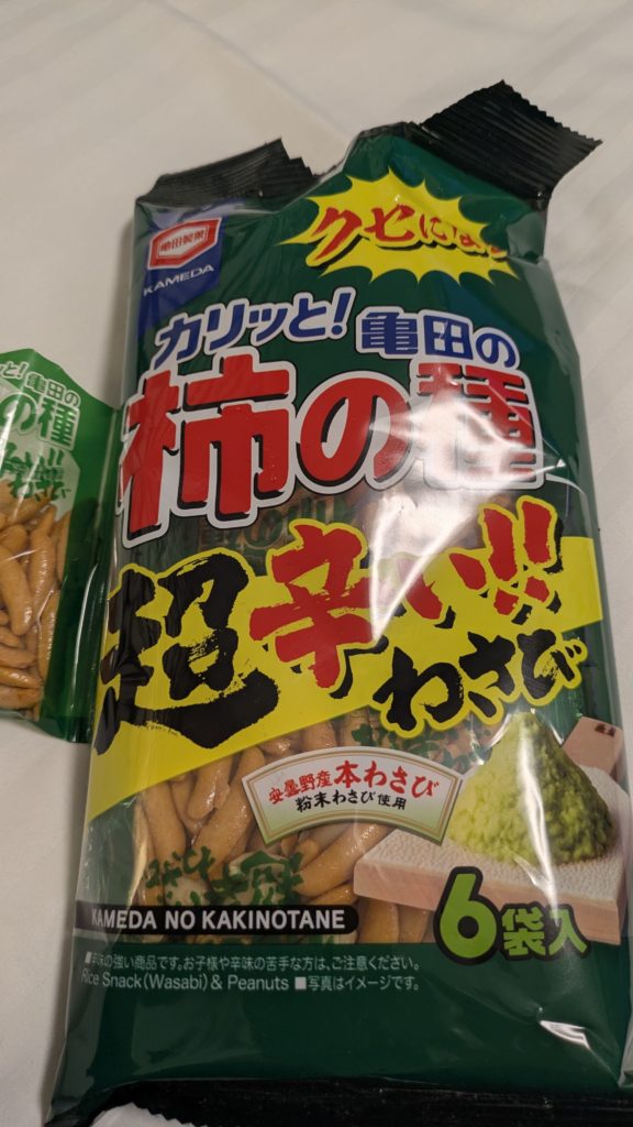 ホテルは大垣駅前のAPAにしました。二次会はコンビニで買った超辛い!!わさびの柿の種。柿の種ですがわさびでつんーとなります。素晴らしい!