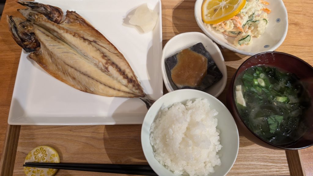 夕食は鯖の開きと最後のポテサラ。(笑)中ぐらいの男爵いも4つとリンゴ半分、きゅうり半分、ハム1パック。これで3回の食事に登場。コスパよし。